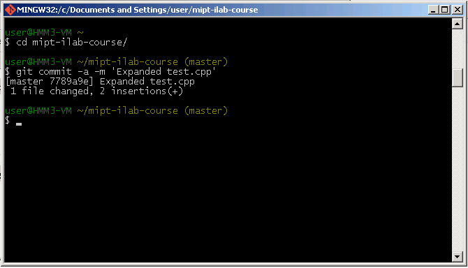 cd mipt-ilab-course. Вы должны находиться внутри файловой структуры проекта почти всегда, когда выполняете какие-то команды git, чтобы программа знала, с каким именно репозиторием вы работаете. -